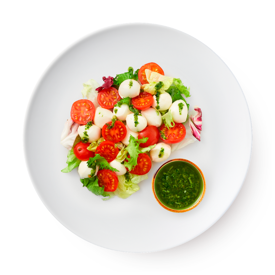Моцарелла мини, черри, песто, смесь салатов айсберг, радиччо, фриссе.