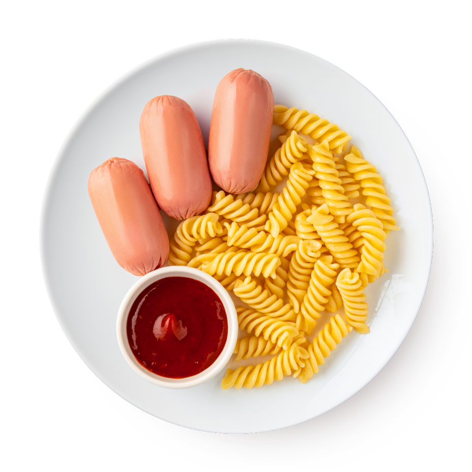 Сардельки (говядина, масло подсолнечное, лёд, соль, молоко сухое, яйца, соевый белок, крахмал, специи, нитрит натрия Е250), паста фузилли отварная (вода, макароны Фузилли, соль, масло подсолнечное), кетчуп (томатная паста, вода, фруктовая паста, соль, консерванты, загустители и натуральные специи).