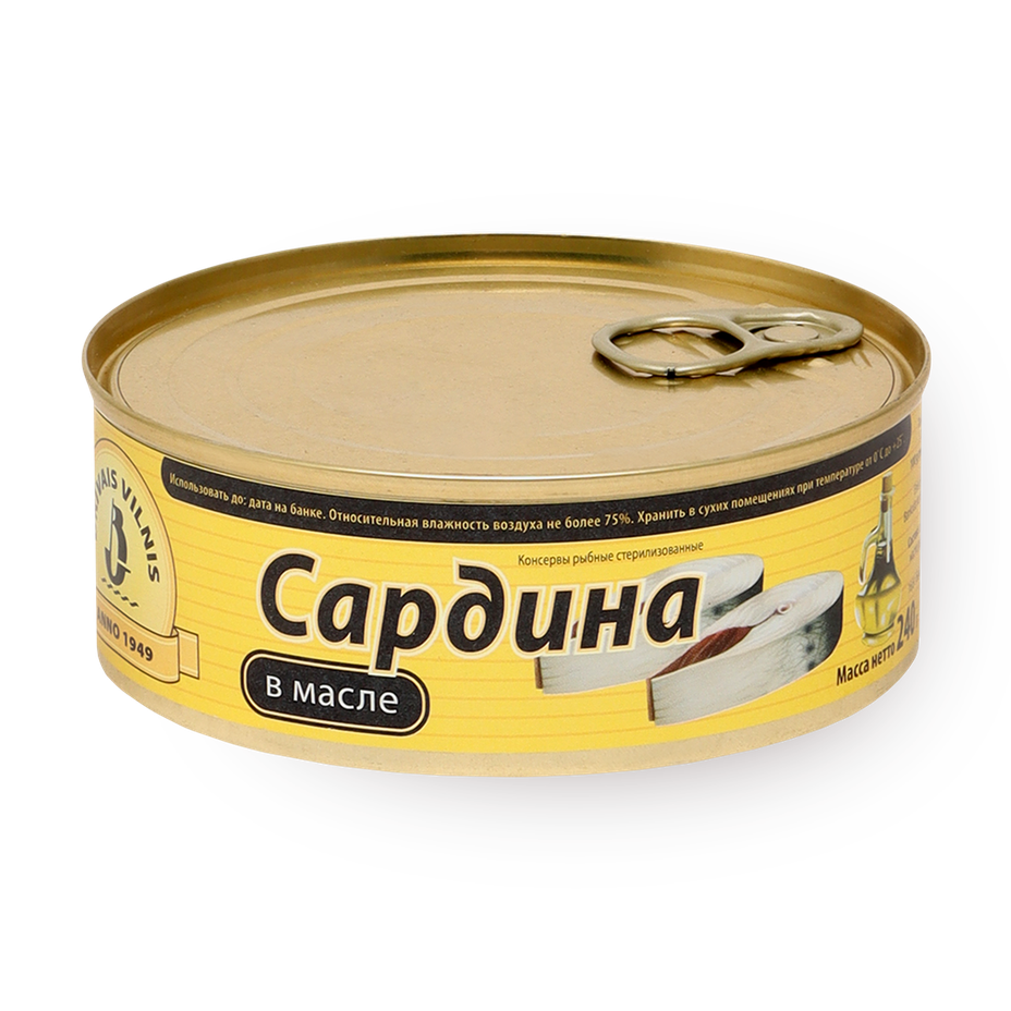 Сардина (70%), рапсовое масло 29%, соль 1%, перец.