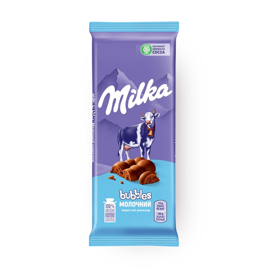Этот молочный шоколад с пузырьками воздуха легко тает во рту. В нём есть лёгкий ореховый привкус, который сочетается со сладостью.