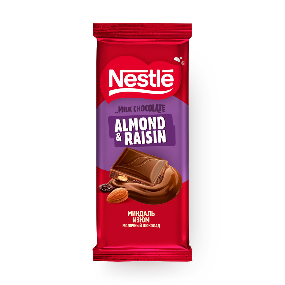 Этот молочный шоколад сочетает дроблёный миндаль и сладкий изюм. Можно взять с собой в качестве перекуса или добавить в выпечку.