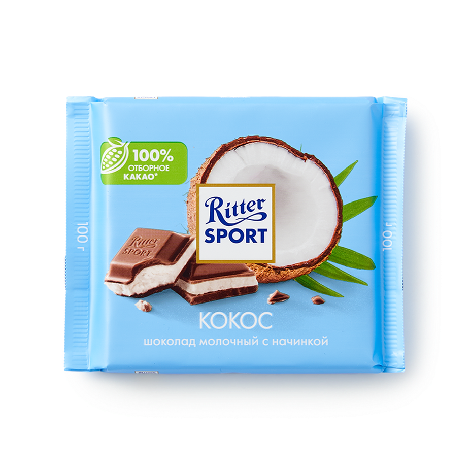 Молочный шоколад с начинкой из кокосовой стружки, которая придаёт мягкость. Можно съесть плитку целиком или разделить на кусочки.