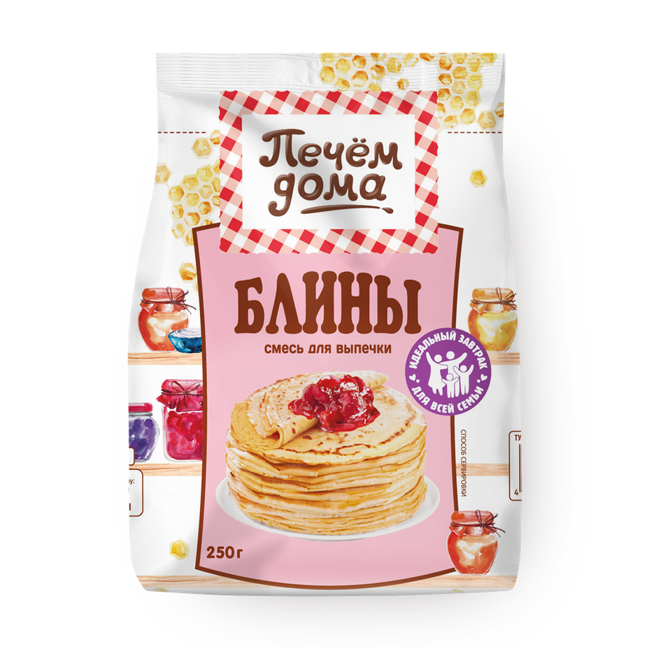 Эта смесь содержит пшеничную муку, сахар и яичный меланж, которые придают блинам пышность. Готовые блины можно подать со сметаной или вареньем.