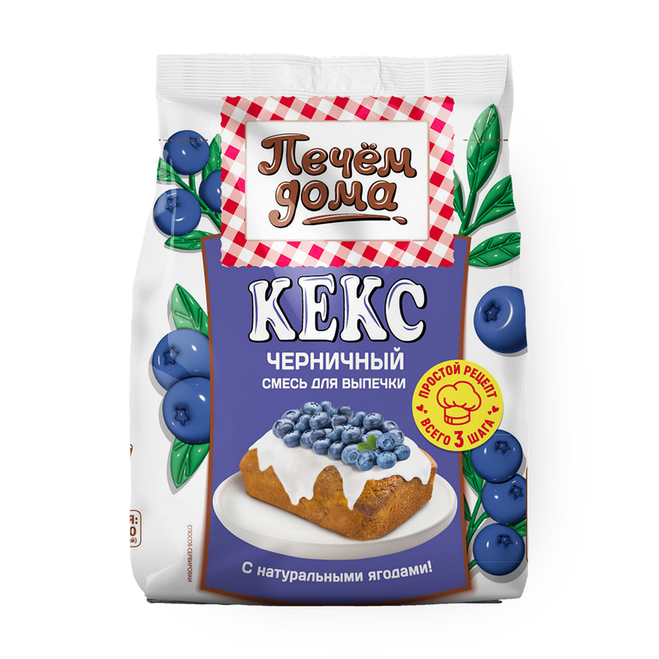 Эта смесь содержит пшеничную муку, сахар и яичный меланж, которые нужны для выпечки кекса. Можно добавить чернику или другие ягоды по вкусу.
