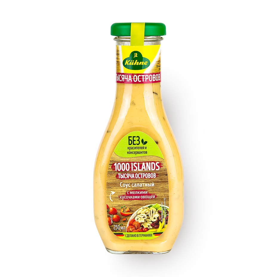 Вода, рапсовое масло (15%), глюкозно-фруктозный сироп (глюкоза, фруктоза), уксус спиртовой, томатная пюре (5%), лук (5%), корнишоны (4%), сахар, красный перец (1,8%), молочная сыворотка, соль, модифицированный кукурузный крахмал, семена горчицы, зубчики чеснока (0,6%), сок лимонный концентрированный, загустители: гуаровая камедь, ксантановая камедь, специи: чеснок, перец, лук, натуральный ароматизатор: огурцы.