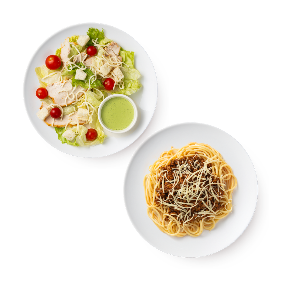Спагетти Болоньезе Mazzali и Цезарь с курицей Mazzali