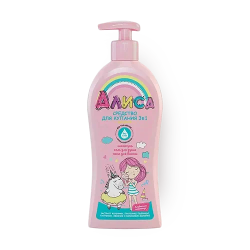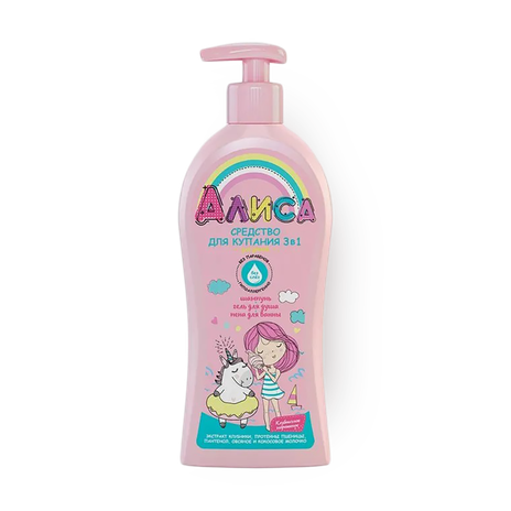 Это средство подходит для мытья волос, тела и купания малышей. В нём есть экстракт клубники, который придаёт лёгкий аромат.