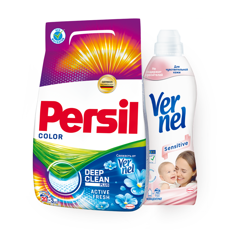 Стиральный порошок Persil Color, 3 kg + Кондиционер для белья Vernel Sensitive концентрированный, 960 ml