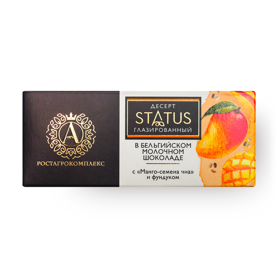 Сырок глазированный STATUS «Ростагроэкспорт» в молочном шоколаде с наполнителем манго, семена чиа и фундуком