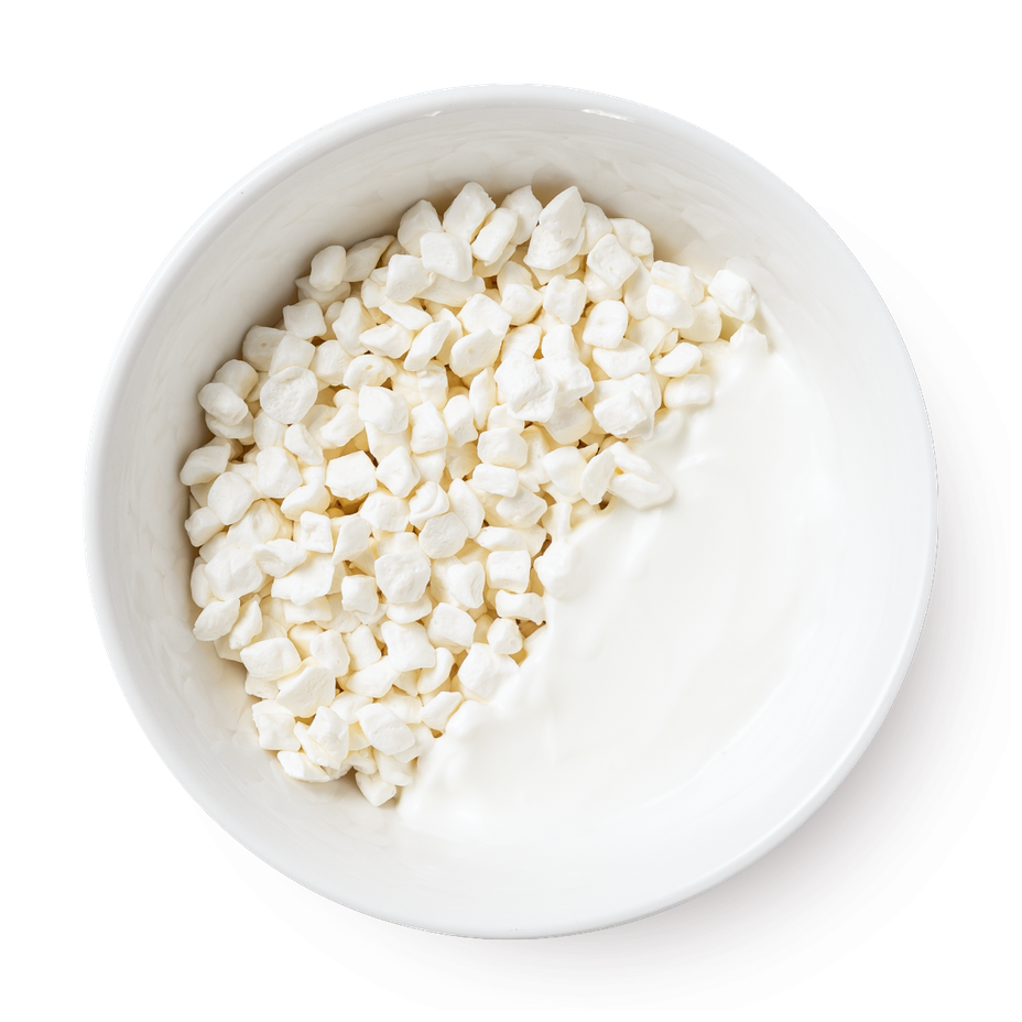 Творог с мягкими зёрнами и сметаной, который дополнен клубничным соусом. Можно есть на завтрак или в качестве лёгкого перекуса.
