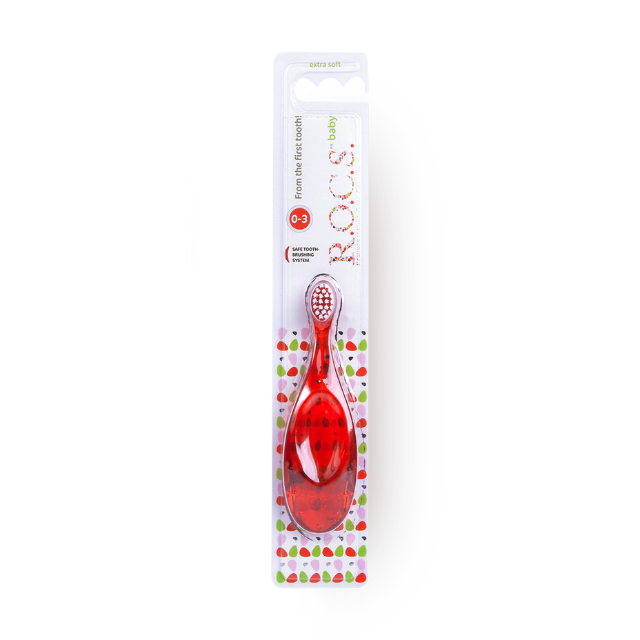 Эта щётка подходит для малышей от 0 до 3 лет. У неё мягкие щетинки, которые бережно очищают первые зубки.