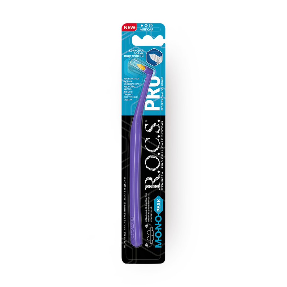 Эта щётка с мягкой щетиной подходит для бережного ухода за зубами. Её монопучковая форма помогает очищать труднодоступные места.